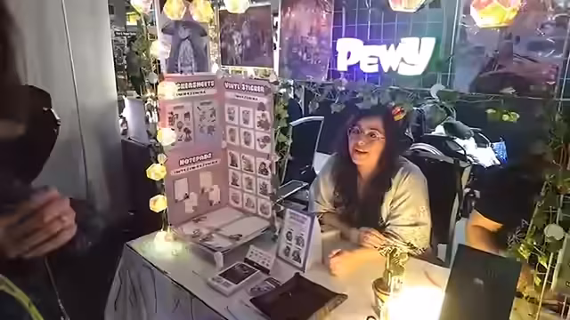 01:35:51Der Streamer besucht den Jubis-Stand, der sich auf Pixelart spezialisiert hat. Dort werden verschiedene handgefertigte Artikel wie Ketten, Sticker, Ohren und mehr gezeigt und vorgestellt. Die Streamerin zeigt sich begeistert von der Qualität und Liebe, die in den Produkten steckt, und erwähnt, dass sie selbst eine Kete erhalten hat.