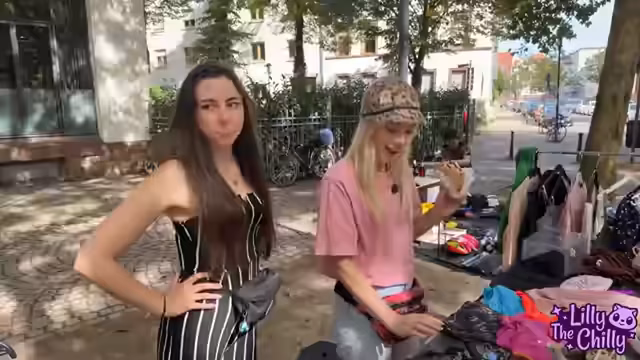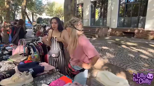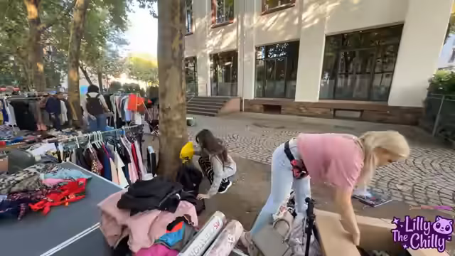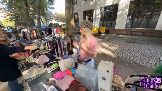 04:08:12Der Aufbau des Flohmarktstandes ist in vollem Gange, Stühle fehlen und die Kette einer Tasche verschwindt in einer Swarovskibox. Lilly stellt ihr neues T-Shirt vor, das im Stream schon Aufsehen erregte. Sie trägt Oversized-T-Shirts und deutet an, dass bei Didi der Bauchnabel immer noch als Mode gilt. Die Streamerin ist erleichtert, als eine halbe Kiste leer ist, und stellt fest, dass der Stand trotz der Mühe übersichtlicher wirkt, sobald mehr Dinge weggehen.