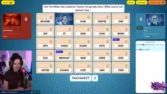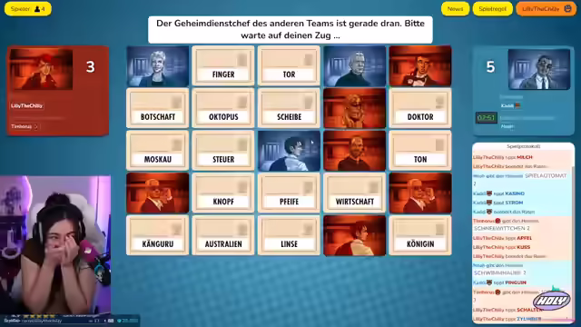 02:23:53Eine neue Runde beginnt mit Begriffen wie 'Kuh', 'Bulle', 'Milch' und einem 'Random-Wort', das für Unmut sorgt. Lilly hat ein Wildschwein neben ihrem Namen, das sie gekauft hat, um Begriffe aufzudecken. Es folgt eine Diskussion über 'Spielautomat', 'Casino', 'Steuer' und 'Strom'. Lilly entscheidet sich für 'Steuer' anstelle von 'Strom'. Es wird über Schneewittchen und Märchen gesprochen. Eine Schwimmhaube wird mit einem Oktopus und einem Haubentaucher in Verbindung gebracht. Tim konzentriert sich auf 'Joystick', 'Schalter', 'Finger' und 'Knopf'. Lilly wird humorvoll für ihre Interpretation von 'Zylinder' kritisiert. Es wird überlegt, ob es viele Haubentaucher in Australien gibt. Die Begriffe 'Königin', 'Schloss', 'Thor' und 'Doktor' werden diskutiert. Lilly entscheidet sich für 'Australien' aufgrund der Haubentaucher. Tim überlegt, wie er 'Lenkrad', 'Knopf' und 'Finger' miteinander verbinden kann und entscheidet sich schließlich für 'Steuern'.