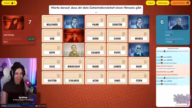 02:50:32Die Diskussion dreht sich um den Begriff 'Triebwerksbrand' und mögliche Verbindungen zu 'Fahrzeug', 'Jet', 'Bremse' und 'Funken'. Eine Zigarre kann auch einen Brand verursachen und wird auch 'Kippe' genannt. Die Begriffe 'Feige', 'Kapitän', 'Schlange', 'Altar' und 'Gang' werden genannt. Es wird überlegt, ob 'Rede' ein Begriff aus der Jugendsprache ist und ob 'Gang' damit in Verbindung steht. Es wird spekuliert, dass der Hinweis auf 'Rede' etwas Wildes bedeuten könnte. Ein Kapitän, Sekretär, Millionär oder Dieb können reden. Es wird überlegt, ob 'Löwe' mit 'Rede' in Verbindung gebracht werden kann. Die Begriffe 'Bremse' und 'Zigarre' werden genannt, um einen Brand auszulösen. Es wird überlegt, was Cardi zum Geburtstag möchte, wobei hübsche Deko für den Hintergrund genannt wird. Wenn man sich bei einem Wort nicht sicher ist, kann man Tim per Discord fragen. Lillys Nichte wünscht sich schöne Blumen und gutes Essen. Es wird über 'falsche Zähne' und 'Tabakanbau' gesprochen. Zigarre und Kippe sind Tabakprodukte. Tabak wächst auf Palmen. Es wird überlegt, ob 'Schlange' im Zusammenhang mit 'Tabakanbau im Dschungel' Sinn macht. Cardi muss zaubern, um die Runde zu gewinnen.