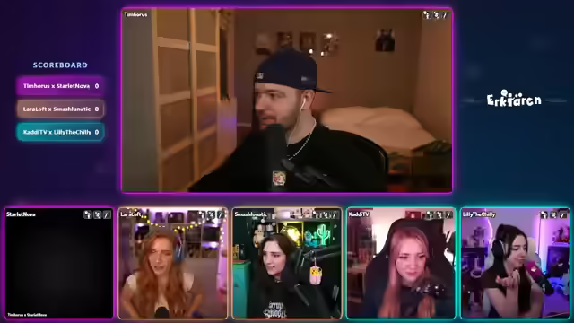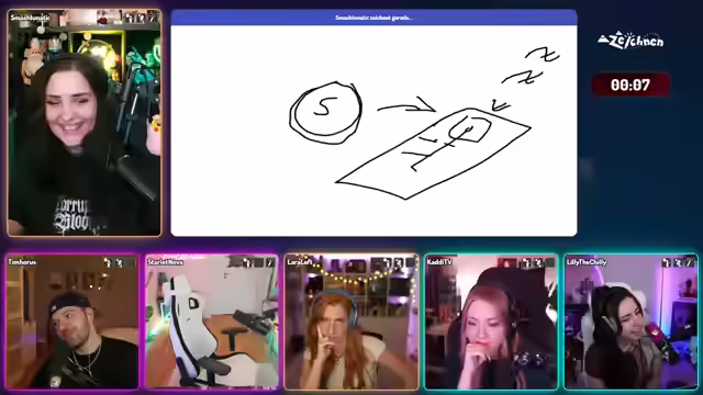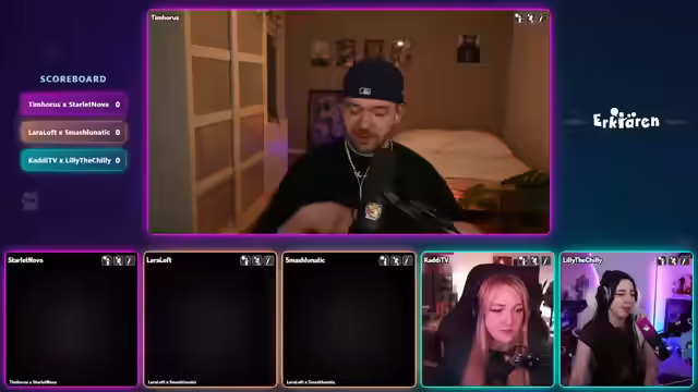 04:51:47Es wird spontan entschieden, Dreierteams für Activity auszuprobieren, was eine Premiere für das Format darstellt. Die Teams werden neu eingeteilt: Tim Horus, Lara Loft und KDTV gegen Starlet Nova, Lilly the Chili und Smash Lunatic. Während der Vorbereitungen erzählt Tim einen Witz, gefolgt von einem Dark-Humor-Witz. Es wird kurz über die Länge der Teamnamen diskutiert und wie man sie am besten abkürzt, damit alles gut auf dem Bildschirm dargestellt wird. Man einigt sich darauf, die Namen unter den Kameras anzuzeigen, um Platz zu sparen. Die Streamerin äußert die Hoffnung, dass Dreierteams lustiger sein werden, da mehr Leute mitraten können und das Team insgesamt schlauer ist. Die erste Spielrunde in den neuen Teams beginnt mit dem Spiel Activity, wobei die Begriffe 'Überrasch sein, Schock' und 'Handschellen' erraten werden, aber 'Biergarten' scheitert.