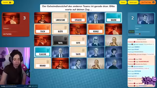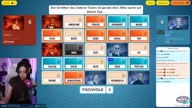 02:09:26Die Spielrunde von Codenames geht weiter, wobei die Teilnehmer über die Bedeutung und Assoziationen der gewählten Wörter diskutieren. Tim hatte Glück mit seiner Interpretation von 'Volk', was ihm zum Sieg verhalf. Die Überlegungen kreisen um 'Fischvolk' und mögliche Verbindungen zu 'Hering' und 'Start'. Verschiedene Begriffe wie 'Libesine', 'Straße', 'Krankheit' und 'Bauer' werden auf ihre Relevanz geprüft. Der Gedanke einer 'Fischstraße' wird humorvoll verworfen. Die Kombination 'Staat' und 'Frankreich' wird aufgrund der Verbindung zu 'Volk' als sinnvoll erachtet. Es folgt eine Diskussion über die Wortwahl 'Theater', 'Shakespeare' und 'Tafel', wobei mögliche Verbindungen und Interpretationen erörtert werden. Die Schwierigkeit der Wörter wird hervorgehoben und die Frage aufgeworfen, ob die Gegner es schwerer haben, wenn sie nur 'Theater' mit zwei Begriffen kombinieren können. Lilly assoziiert 'Theater' mit 'Shakespeare', 'Romeo und Julia' und 'Tod'. Die Überlegung, dass die gefundenen Wörter möglicherweise nicht die ursprünglich gemeinten sind, wird als mögliche Erklärung für den Erfolg ins Spiel gebracht.