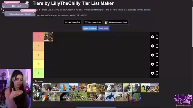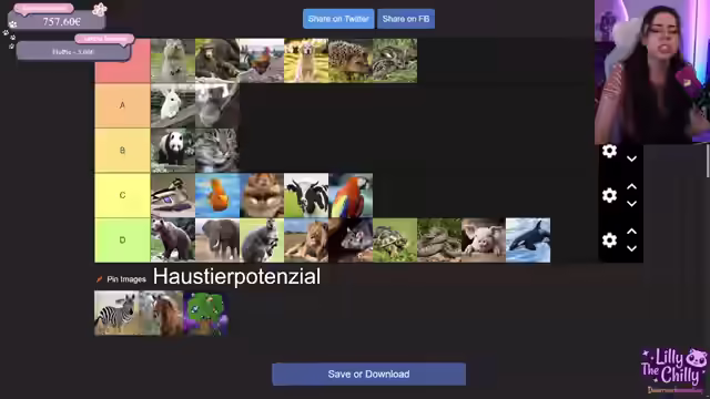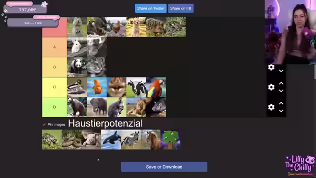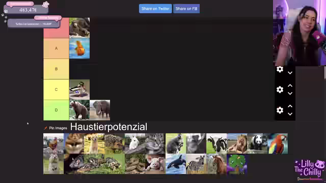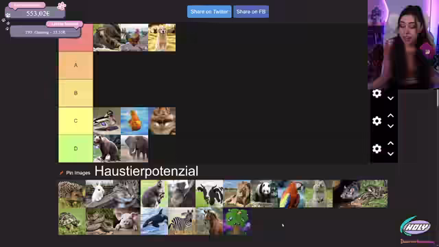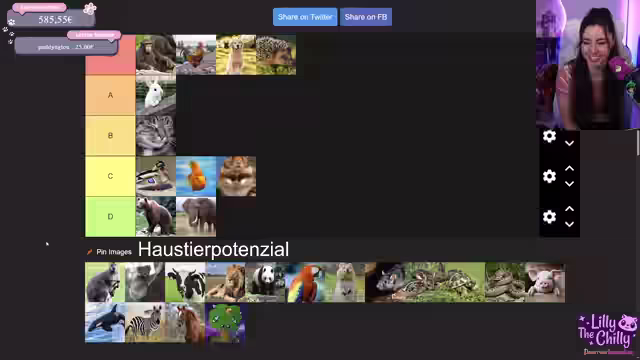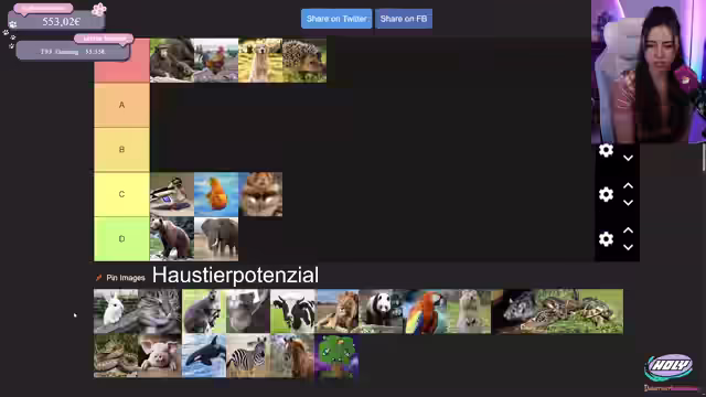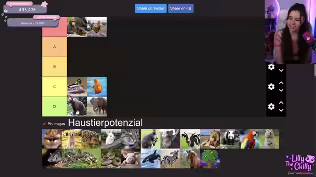 00:42:18Die Tierlist wird gestartet, wobei es darum geht, zu bewerten, welche Tiere sich am besten als Haustiere eignen. Teddy hat die Tierlist erstellt, und die Idee ist, die Tiere danach zu ordnen, welches man am liebsten als Haustier hätte. Die Streamerin erklärt, dass es nicht darum geht, welches Tier cooler ist, sondern welches als Haustier angenehm wäre. Als erstes Tier wird ein Affe betrachtet. Die Streamerin findet die Idee, einen Affen als Haustier zu haben, reizvoll, da sie intelligent sind und Aufgaben übernehmen könnten. Sie stellt sich vor, dass der Affe sogar kochen könnte. Sie entscheidet sich, den Affen auf S-Tier zu platzieren, da sie glaubt, dass er viel beisteuern und helfen könnte. Als nächstes wird ein Bär betrachtet. Obwohl die Vorstellung eines Teddybären süß klingt, wird betont, dass Bären gefährlich sind. Die Streamerin entscheidet sich, den Bären auf D-Tier zu platzieren, da sie ihnen nicht trauen würde. Als nächstes wird ein Elefant betrachtet. Die Streamerin hat keine Ahnung, wo sie den Platz für einen Elefanten herbekommen sollte und möchte ihn nicht einsperren. Außerdem würde er viel Futter benötigen. Sie entscheidet sich, den Elefanten auf D-Tier zu platzieren.