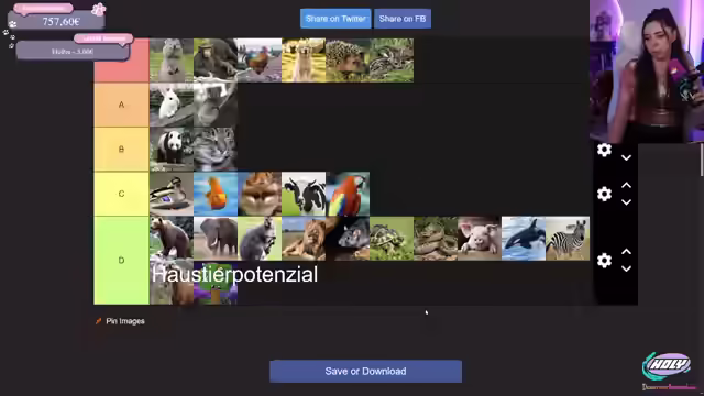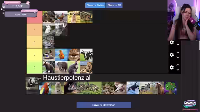 01:29:28Ein Zuschauer spendet und wünscht sich eine Giraffen-Imitation. Die Streamerin sucht auf YouTube nach Giraffen-Geräuschen, da sie keine Ahnung hat, wie eine Giraffe klingt. Nach dem Abspielen eines Videos versucht sie, eine Giraffe zu imitieren. Es wird überlegt, welche anderen Tiergeräusche die Zuschauer hören möchten. Die Streamerin bietet an, für Spenden über 10 Euro jedes Tier nachzumachen. Hunde werden als nächste Tierart besprochen und auf S-Tier gesetzt. Die Streamerin erzählt, dass sie sich schon immer einen Hund gewünscht hat, aber ihre Eltern es nie erlaubt haben. Sie schwärmt von der Liebe und Freude, die ein Hund einem geben kann. Es wird diskutiert, ob man einen Hund haben sollte, wenn man ihm nicht das bieten kann, was er verdient. Einige Zuschauer setzen Hunde auf D-Tier, was für Empörung sorgt. Die Streamerin erklärt, dass sie es verstehen könnte, wenn man Hunde aufgrund des hohen Pflegeaufwands schlechter bewertet. Es wird über die Vor- und Nachteile von Hunden als Haustiere gesprochen, wobei die Liebe, die sie geben, und der hohe Pflegeaufwand thematisiert werden.