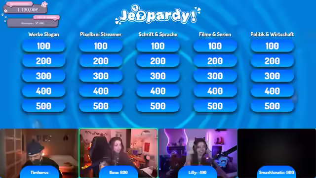04:45:48Die erste Quizrunde beginnt mit Fragen zu verschiedenen Kategorien wie Politik und Wirtschaft, Werbeslogans, Pixelbrei Streamer, Schrift und Sprache sowie Film und Serien. Die Kandidaten wählen Kategorien und Punktezahlen aus und versuchen, die Fragen zu beantworten. Es gibt Diskussionen über die Schwierigkeit der Fragen und Unsicherheiten bei den Antworten. Die Streamerin hat technische Probleme mit ihrem Buzzer-Sound, was zu Verwirrung und dem Hinweis des Chats führt. Trotz der technischen Schwierigkeiten wird die Show fortgesetzt, und die Kandidaten wählen weiterhin Kategorien und beantworten Fragen. Die Stimmung ist humorvoll und es gibt viele Kommentare und Interaktionen zwischen den Teilnehmern und dem Chat.