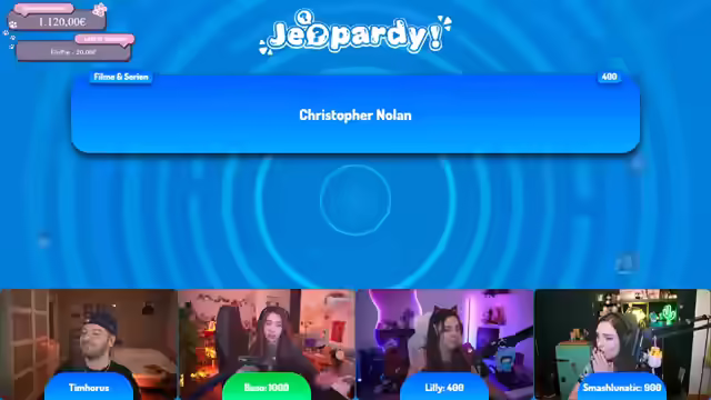 05:32:50Franzi wählt 'Politik und Wirtschaft 400' für Lilly, was als schwierige Frage angesehen wird. Es geht um die letzte signifikante Wirtschaftskrise in Deutschland. Es wird überlegt, ob es die Corona-Zeit war, aber die Antwort ist falsch. Die richtige Antwort ist 2008/2009, ausgelöst durch den Zusammenbruch der US-Immobilienmarktes. Es wird ein Film namens 'The Big Short' empfohlen, der das Thema behandelt. Anschließend wird die Kategorie 'Pixelbrei-Streamer 500' gewählt. Es wird geraten, welcher Streamer auf dem Bild zu sehen ist, wobei Luna genannt wird, aber die richtige Antwort Rose ist. Franzi wählt 'Filme und Serien für 100', und die Frage lautet, welcher berühmte Regisseur die Filme Interstellar und Oppenheimer gedreht hat. Die Antwort ist Christopher Nolan. Es folgt 'Werbeslogan 400', bei dem es um den Slogan 'Freude am Fahren' geht, der zu BMW gehört. Zuletzt wird 'Schrift und Sprache 400' gewählt, bei dem es darum geht, welcher Buchstabe in der deutschen Sprache am häufigsten verwendet wird. Die Antwort ist E. Das erste Board wird erfolgreich abgeschlossen und es gibt neue Kategorien: Männergegenstände, Unterhaltung, Streamerzeichnungen, New Gen-Anime-Intros und Natur und Umwelt.