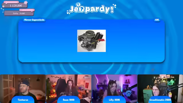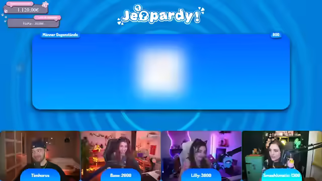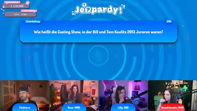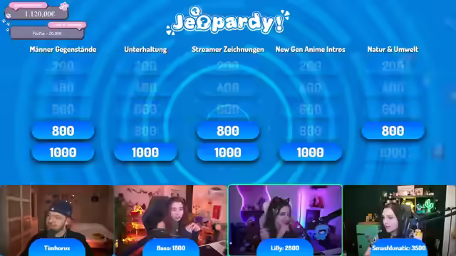 05:44:16Franzi wählt 'New Generation Anime-Intros 200'. Es wird ein Intro abgespielt und geraten, welcher Anime es ist. Die Antwort ist Jujutsu Kaisen. Malu wählt 'Streamer-Zeichnungen 200'. Es muss erraten werden, was der Streamer Matteo gezeichnet hat. Die Antwort ist Lasagne. Linda wählt 'Natur und Umwelt 600'. Es geht um die Meeresströmung im Atlantik, die maßgeblichen Anteil am Klima hat. Die Antwort ist der Golfstrom. Lilly wählt 'Unterhaltung 200'. Es geht um die Castingshow, in der Bill und Tom Kaulitz 2013 Juroren waren. Die Antwort ist DSDS. Franzi wählt 'Männergegenstand für 600'. Es muss erraten werden, was für ein Gegenstand gezeigt wird. Die Antwort ist Pose (Angelzubehör). Linda wählt 'Natur und Umwelt 200'. Es geht darum, welchem Tier ein Löwe in freier Wildbahn normalerweise nicht begegnen kann. Die Antwort ist Tiger. Lilly wählt 'Anime 400'. Es muss erraten werden, welches Intro gespielt wird. Die Antwort ist Chainsaw Man. Franzi wählt 'Streamer-Zeichnungen 400'. Es muss erraten werden, was die Streamerin Lara Loft gezeichnet hat. Die Antwort ist Matteo. Linda wählt 'Männergegenstände 200'. Es muss erraten werden, wie der Gegenstand heißt. Die Antwort ist Vorschlaghammer.