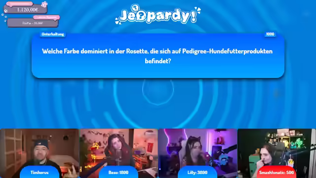 06:22:03Die Kategorie Streamerzeichnung für 1000 wird gespielt, wobei es darum geht, was die Streamerin Starlet Nova darstellen wollte. Die richtige Antwort ist Heiratsantrag. Anschließend folgt Männergegenstände für 1000, bei dem ein Multimeter gezeigt wird. Es wird überlegt, wie das Gerät heißt und wofür es verwendet wird. Danach kommt Unterhaltung für 1000, wobei eine Frage zur Farbe in der Rosette auf Pedigree Hundefutterprodukten gestellt wird. Es kommt zu einigen Missverständnissen bezüglich des Begriffs 'Rosette', die zu humorvollen Verwechslungen führen. Schließlich wird die richtige Antwort aufgedeckt: Rot.