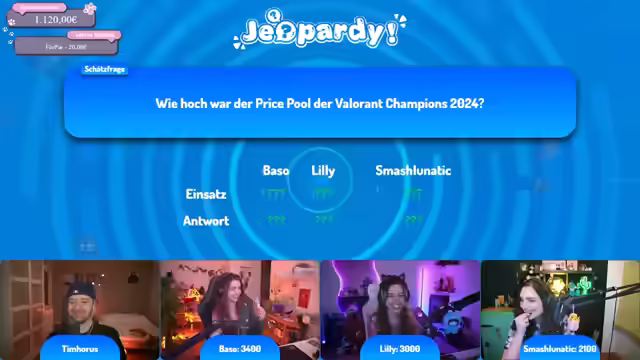 06:38:35Es beginnt das finale Jeopardy-Board mit einer Schätzfrage zum Preispool der Valorant Champions 2024 in US-Dollar. Die Teilnehmer setzen ihre Punkte, und es wird überlegt, wie das mit dem Einsatz funktioniert. Es folgt eine Diskussion über Valorant und die Höhe der Einsätze. Die korrekte Bezeichnung für Inbusschlüssel wird nochmals klargestellt: Innen-Sechskant-Schlüssel. Es wird betont, dass es sich um einen lustigen Abend handelt und niemand die Sache zu ernst nehmen soll. Schließlich werden die Antworten aufgedeckt, und der Preispool beträgt 2,25 Millionen US-Dollar. Smaluwa gewinnt das Jeopardy mit 4100 Punkten.