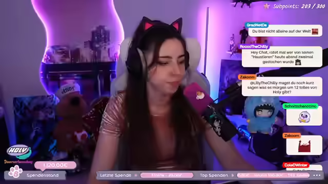 lillythechilly hat eine Spendenaktion für die Organisation 'Notpfote' ins Leben gerufen, die sich um Tiere in Kriegs- und Krisengebieten kümmert. Die Aktion umfasst eine Quizshow und eine Tierlist, bei der Zuschauer ihre Haustiere bewerten lassen können. Ziel ist es, Spenden für die Versorgung von Tieren in Not zu sammeln. Die Aktion läuft die ganze Woche.