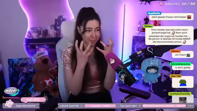 00:28:40Es wird vorgeschlagen, die im Discord geposteten Haustiere der Zuschauer zu bewerten, wobei die Möglichkeit besteht, dass die Zuschauer noch Zeit haben, Bilder ihrer Haustiere hochzuladen. Zunächst soll jedoch eine Tierlist erstellt werden. Das Overlay für den Spendenstream wird gelobt und die einfache Einrichtung hervorgehoben. Die Streamerin reflektiert über ihre Entwicklung im Laufe der Zeit, insbesondere über den Abbau von Schamgefühlen und die Steigerung des Selbstbewusstseins. Sie erzählt, dass sie früher schüchterner war und sich mehr Gedanken darüber gemacht hat, was andere Leute denken. Durch das Streamen hat sie gelernt, selbstbewusster zu sein und sich weniger für Kleinigkeiten zu schämen. Es wird auf alte Clips verwiesen, die diese Veränderung verdeutlichen. Die Streamerin betont, dass sie auch während des Streams essen muss und ihren Essenszyklus nicht ändern wird. Sie erklärt, dass sie schon lange einen Spendenstream machen wollte, aber Angst vor der Organisation und davor hatte, etwas falsch zu machen. Durch die Unterstützung von Vlesk wurde es ihr jedoch ermöglicht, diesen Stream zu realisieren und ihre Reichweite für einen guten Zweck zu nutzen.