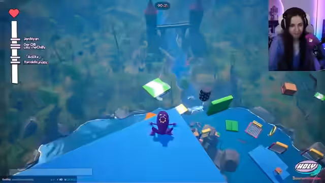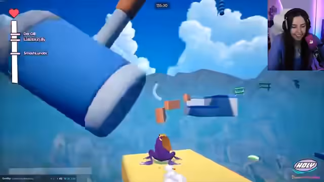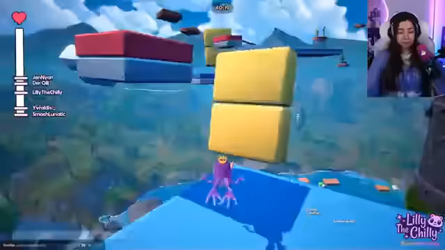02:48:29Nach dem Start des Spiels bricht reines Chaos aus. Die teilnehmenden Spieler, die Streamerin eingeschlossen, haben Schwierigkeiten mit den Steuerungen und der Physik des Spiels. Ständig stürzen die Charaktere von den Plattformen oder werden von anderen Spielern heruntergestoßen. Obwohl einige Spieler wie Jen und Claudi rasch vorankommen, kämpfen die anderen, insbesondere die Streamerin, die ihre Krankheit als Entschuldigung nutzt, damit, auch nur die einfachsten Hindernisse zu überwinden.