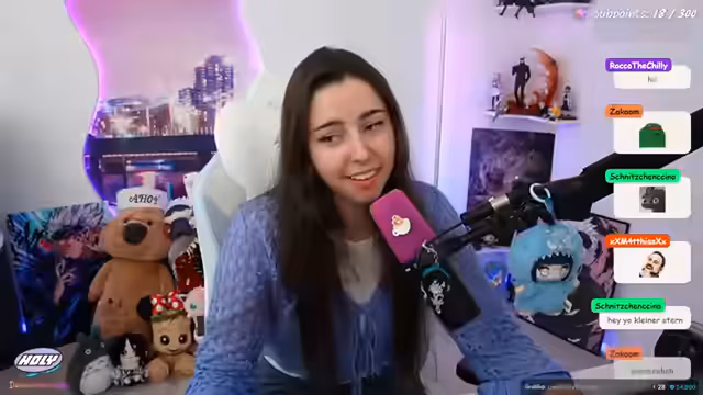 01:36:10Die Streamerin und ihre Interaktionspartner unterhalten sich über verschiedene Themen wie das Clippen von Haaren, peinliche Erlebnisse auf der Gamescom und einen Vorfall bei der Gamescom, bei dem sie eine Person nicht erkannt hat. Es werden auch wiederholte Interaktionen mit dem Chat, wie Grüße und Dankesworte, gezeigt, was die enge Bindung zur Community unterstreicht.