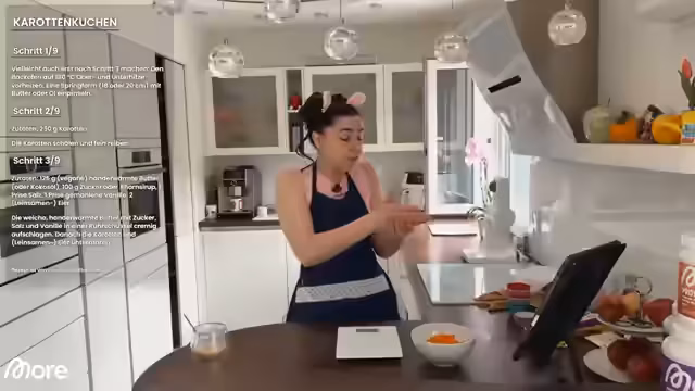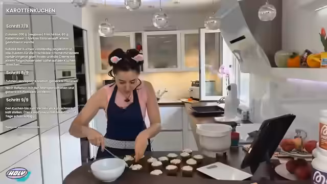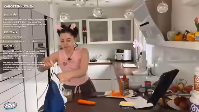 00:51:52Nach der Verlosung und einigen technischen Anfangsschwierigkeiten wechselt Lilly in ihre Küche. Der Fokus liegt auf der Zubereitung von Karottenkuchen-Muffins. Lilly stellt fest, dass sie anstatt des Kuchens lieber Muffins backt und dafür keine passenden Förmchen hat. Die Zutaten wie Karotten, Butter und Pistazien werden besprochen und die ungewöhnliche Textur der Pistazien shells erwähnt.