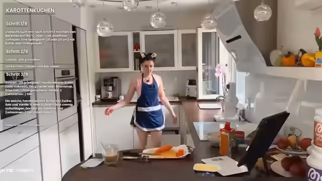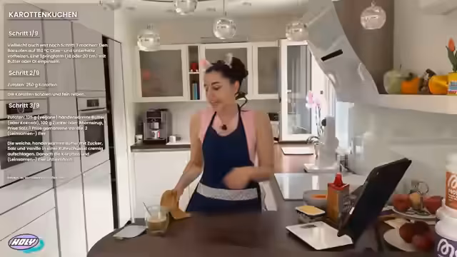 01:32:15Die Streamer beginnt mit der Zubereitung eines Karottenkuchens und gerät sofort ins Schwitzen. Es kommt zu mehreren technischen und rezeptbezogenen Problemen. Das Rezept verlangt 250 Gramm geriebene Karotten, doch die anfängliche Menge scheint zu gering. Beim Abrühren werden die Hände schmutzig. Die Zutaten wie Vanillepaste und Backpulver sind teilweise abgelaufen, was sie aber für unproblematisch hält und trotzdem verwendet. Der Teig entwickelt eine ungewöhnliche, flüssige Konsistenz, die sie als widerlich und eklig empfindet.