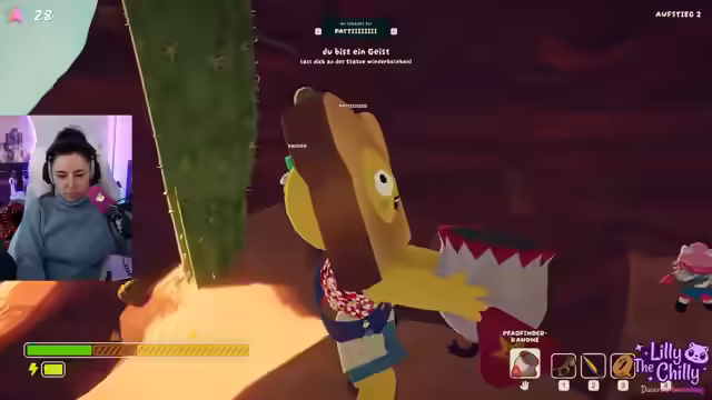 01:12:04Die Gruppe setzt ihre abenteuerliche Reise fort, wobei humorvolle Kommentare und unerwartete Ereignisse die Stimmung auflockern. Es werden Koffer und Leuchtfackeln entdeckt, während die Gruppe über die Qualität eines gefundenen Pilzes rätselt. Bing-Bong, ein Charakter, wird humorvoll als 'Müll' bezeichnet und zurückgelassen. Die Gruppe verliert Juli und Patti, was jedoch nicht weiter tragisch genommen wird. Es folgt die Frage, ob jemand die schwerste Stufe des Spiels bereits geschafft hat. Die Streamerin erwähnt, Peak 6 erreicht zu haben, aber noch keinen Versuch mit höheren Peaks unternommen zu haben, da sie sich auf einen Umzug konzentriert. Es wird über den Umzug gesprochen, der noch nicht begonnen hat. Die Streamerin wundert sich, warum Jenna einfach vorläuft und fragt sich, ob diese ein 'Lone Wolf' ist. Die Gruppe interagiert mit der Spielumgebung, wobei unklar bleibt, was genau vor sich geht, aber die Streamerin versichert, dass alles in Ordnung sei. Es wird humorvoll angedeutet, dass Jenny 'gegessen' wurde.