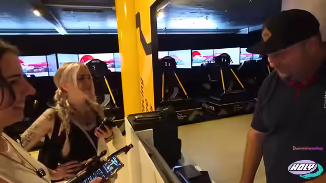 03:44:49Nach dem Axtwerfen wird die nächste Station vorbereitet: das Racing. Die Streamer packen ihre Sachen zusammen und verlassen den Bereich. Es wird humorvoll über einen alten Clip der Streamerin gesprochen, in dem sie beim Autofahren gegen eine Wand gefahren ist. Die Streamer begeben sich zur Racing-Station, wo sie von einem Mitarbeiter begrüßt werden. Es werden verschiedene Rennsimulatoren vorgestellt, die ein realistisches Fahrerlebnis bieten sollen. Die Streamer wählen ihre Fahrzeuge aus: ein Lamborghini für Lilly und ein Honda für Ronja. Sie werden in die Simulatoren eingewiesen und bekommen Kopfhörer, um während des Rennens miteinander kommunizieren zu können. Die Vorfreude auf das Racing ist groß.