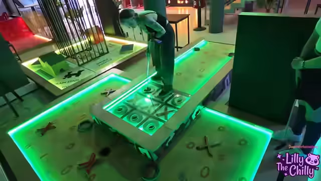 02:37:15Die Gruppe beschließt, eine letzte Runde Minigolf zu spielen, bevor sie zum Axtwerfen übergeht. Es wird darüber gesprochen, welche Bahn als letzte gespielt werden soll, wobei die Entscheidung auf eine Bahn mit einem Feuer-Effekt fällt. Es wird die Ausrüstung zusammengepackt und zur nächsten Station gebracht. Am neuen Tisch angekommen, wird die Optik des Schwarzlicht-Golfs bewundert und über Tipps und Tricks für die Bahn diskutiert. Es wird analysiert, wie man den Ball am besten platziert, um durch verschiedene Löcher und Hindernisse zu gelangen. Die Reihenfolge der Spieler wird festgelegt, und es wird sich gegenseitig angefeuert, einen 'One in a Hole' zu erzielen. Nach der Runde werden die Ergebnisse verglichen und die Gesamtstatistik präsentiert. Es wird festgestellt, dass eine Spielerin, Ronja, aufgrund eines früheren Spiels mit Game of Thrones-Bezug eine hohe Punktzahl erreicht hat. Die Gruppe freut sich auf die bevorstehende Arcade-Halle und das Axtwerfen. Es wird Lilly dafür gelobt, dass sie den Ausflug geplant und organisiert hat, um eine schöne Zeit zusammen zu haben. Bevor es zum Axtwerfen geht, werden die Mikrofone abgelegt und die notwendigen Formalitäten erledigt.