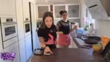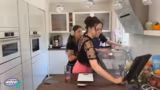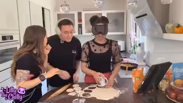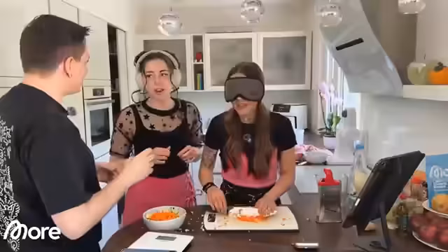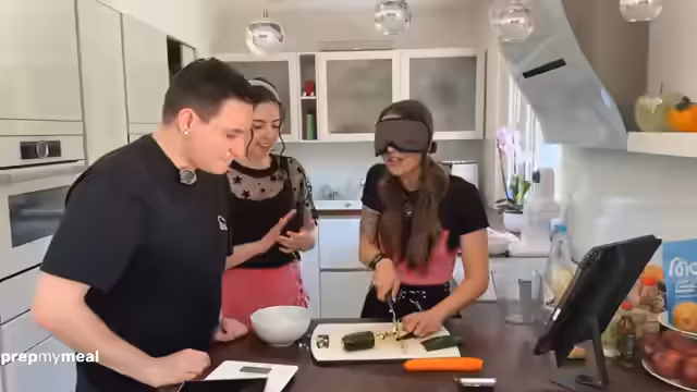01:13:35Live-Chaos startet mit der Vorbereitung der Zucchini. Die Teilnehmerinnen wirken unkoordiniert und überfordert. Juni scheitert beim Schneiden, während Lilly die Situation mit Humor nimmt. Knister verhält sich passiv und wird dafür kritisiert. Es kommt zu interaktionsschwierigkeiten und technischen Problemen mit den Augenbinden.