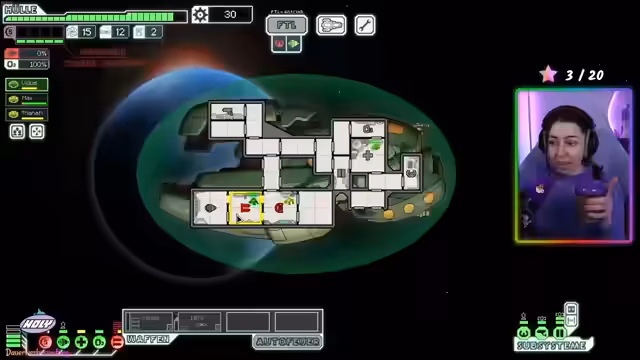 02:34:10Der Stream wechselt zum Spiel FTL: Faster Than Light. Es wird ein neues Spiel gestartet, bei dem ein zufällig zusammengestelltes Team aus den Chat-Mitgliedern Max, Virus und Tenation gebildet wird. Das Schiff befindet sich in einer prekären Situation: Es wird von flüchtigen Kannibalen angegriffen und erleidet schwere Verluste. Nach dem harten Kampf überlebt das Team nur knapp und muss die Systeme reparieren, um in den Raum vorzudringen.