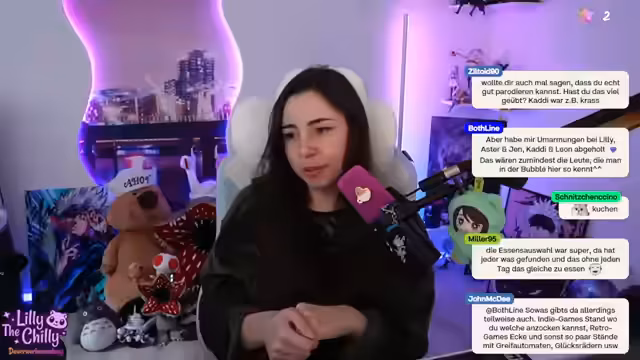 01:28:40Im Vergleich der Messen wird die TwitchCon als gemischt bewertet. Lilly äußert, dass Konzerte nichts für sie sind, da sie zu voll ist und man meist nichts von der Bühne sieht. Ihre positiven Erfahrungen teilt sie mit dem Europa-Park, den sie als besten Freizeitpark bezeichnet. Im Gegensatz dazu war der Besuch der Universal Studios in Japan ein Trauma, da das Fast-Pass-System extrem stressig und ineffizient war und sie für eine 20-sekündige Achterbahn lange anstehen musste.