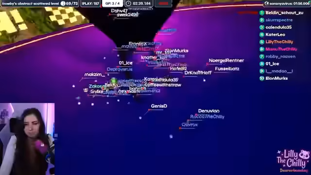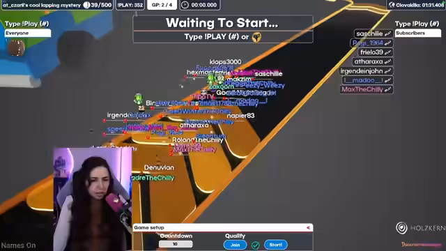 01:54:32Die Streamerin startet mehrere Runden des Spiels 'Marbles' mit der Community. Für den Gewinner jeder Runde gibt es eine Belohnung in Form von 200 Marble-Währung, die zum Kauf von Skins verwendet werden kann. Es kommt zu technischen Problemen, die teilweise für Chaos sorgen und einige Spieler unabsichtlich ausschließen. Die Runden verlaufen chaotisch und werden von der Streamerin humorvoll kommentiert.
