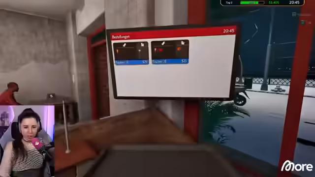 03:30:57Der Stream wechselt zum Spiel 'RapHouse Simulator', in dem der Streamer und Franzi einen Dönerladen betreiben. Das Gameplay schnell in ein chaotisches Abenteuer aus, da sie die anfänglichen Aufgaben wie Brot toasten und Salat zubereiten meistern, aber mit der Kundenbewältigung und der Müllentsorgung überfordert sind. Der Shop wird aufgrund Materialmangel vorübergehend geschlossen, während neue Bestellungen aufgegeben werden, was zu viel Humor und Verwirrung im Chat führt.