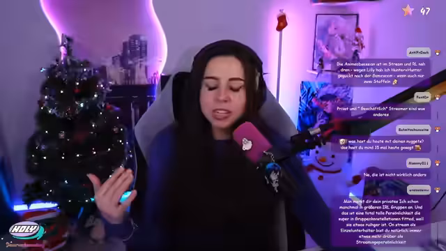 00:17:07Die Streamerin drückt ihre große Freude an den aktuellen Streams aus und betont, wie viel Spaß sie dabei hat. Sie bemerkt einen Chat-Kommentar über einen 'Saarland Weihnachtsmarkt mit Lilly' und fragt scherzhaft, ob sie etwas verpasst habe, was auf eine vergangene Interaktion mit 'Juni' hindeutet. Sie äußert den Wunsch, an ihrem Setup zu entspannen, da sie in letzter Zeit viel unterwegs war und IRL-Streams gemacht hat. Obwohl sie IRL-Streams und Kooperationen schätzt, genießt sie die entspannten 'Just Chatting'-Momente mit ihrer Community. Sie erzählt, dass sie nun viel zu erzählen hat, im Gegensatz zu früher, als ihr Leben weniger ereignisreich war. Ein neuer Zuschauer erwähnt den Kochstream und den 'Dean Winchester Alert', woraufhin die Streamerin ihre Vorliebe für Dean Winchester und Gojo aus Jujutsu Kaisen teilt und erklärt, dass sie viele Gojo-Merchandise-Artikel von ihrer Community geschenkt bekommt, da sie ihre Begeisterung dafür im Stream geäußert hat.
