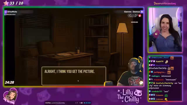 01:52:55Der Stream konzentriert sich auf die Reaktion eines Videos von "Streamclips Germany", wobei verschiedene Clips aus der Gamescom und anderen Streams kommentiert werden. Dabei werden wiederkehrende Running Gags wie perverse Kommentare und die Dynamik zwischen den Personen aufgegriffen. Zum Ende des Streams wird Lillys Kooperation "GrabTab" vorgestellt, ein Programm, bei dem Community-Mitglieder durch das Downloaden und Spielen von kostenlosen Punkten sammeln können, um Gutscheine zu erhalten. Lilly appelliert an ihre Zuschauer, an der Kampagne teilzunehmen.