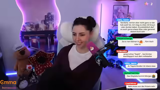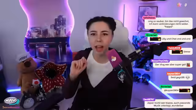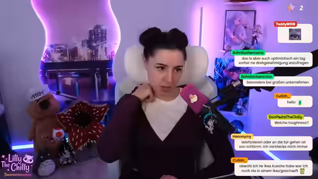 00:12:00Lilly beginnt den Stream und erwähnt, dass sie aufgeräumt hat, motiviert von Franzi. Sie stellt den neuen, aufgeräumten Hintergrund mit neuen Bildern vor und erklärt, sie sei es nicht gewohnt, einen sauberen Hintergrund zu sehen. Sie zeigt die Neugestaltung und ist zufrieden mit dem minimalistischeren Design.