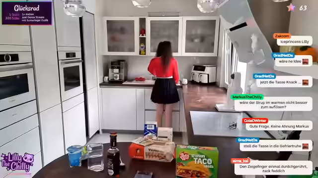 01:44:57Nach den intensiven Marble-Rennen geht der Stream nahtlos in das angekündigte Kochsegment über. Lilly verkündet, dass sie Tacos als Hauptgericht und Tiramisu im Glas als Nachtishighlight zubereiten wird. Sie beginnt mit der Vorbereitung des Nachtischs und stellt alle notwendigen Zutaten wie Mascarpone, Sahne und Espresso bereit. Gleichzeitig erkundigt sie sich nach Rezeptwünschen und baut eine entspannte, gesellige Kochatmosphäre auf.