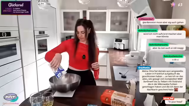 02:12:28Der Prozess des Schlagsahnes gestaltet sich schwierig, da die Sahne nicht steif werden will. Die Streamerin vermutet, dass dies an der Menge oder der Temperatur der Sahne liegen könnte und experimentiert erfolglos mit dem Handrührgerät. Sie äußert den Wunsch nach einem professionelleren Sahnebläser und beschreibt die Herausforderungen, eine stabile Cremestruktur zu erzeugen, was zu Frustration führt. Gleichzeitig wird eine Diskussion über einen unerwarteten Smoothie Maker geführt, der fälschlicherweise bei ihr ankam und kaum genutzt wird.