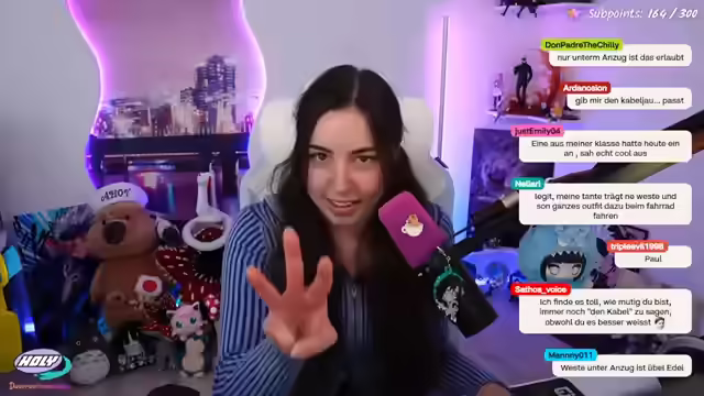 01:00:58Es wird angekündigt, dass im Stream eine Reaktion auf Voll-Content stattfinden wird, gefolgt von einer Runde Thief Simulator 2, in der in die Rolle eines Einbrechers geschlüpft wird. Die Streamerin freut sich besonders darüber, auf dem Thumbnail von Voll-Content zu sein. Es wird kurz über einen neuen Trend bei Voll-Content gesprochen. Die Streamerin zeigt sich fasziniert von dem doppelten Reißverschluss ihrer Jacke und erklärt, wie er funktioniert. Es wird auf einen TikTok unter der Jacke hingewiesen. Die Streamerin betont, dass sie es nicht böse aufnimmt, wenn Zuschauer unbedacht etwas schreiben, solange es nicht als Beleidigung gemeint ist. Sie bittet jedoch darum, vor dem Schreiben darüber nachzudenken, wie etwas beim anderen ankommen könnte. Sie selbst sei nicht nachtragend, solange jemand seinen Fehler einsieht. Es wird kurz über das Thema 'der Kabel' diskutiert, wobei die Streamerin zugibt, dass sie diesen Begriff hartnäckig verwendet, obwohl sie weiß, dass er falsch ist. Es wird kurz über Westen und deren Tragweise gesprochen. Die Streamerin erwähnt, dass sie selbst drei Westen besitzt und sich als Boomer bezeichnet. Es wird ein Zuschauer erwähnt, der beim Fahrradfahren eine Weste trägt.