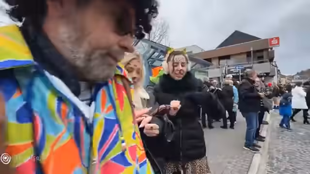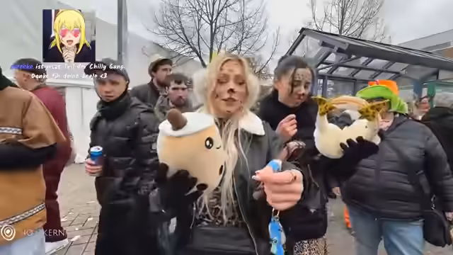 02:52:03Endlich erreicht der Umzugszug die Position der Streamerin. Sie interagieren aktiv mit den Umzugsteilnehmern, Süßigkeiten werden verteilt und entgegengenommen. Die Streamerin merkt, dass ihre Mimik durch das Kostüm unnahbar wirken könnte. Sie sind sich nicht sicher, ob sie als Teil des Umzugs oder als Zuschauer wahrgenommen werden. Die Stimmung ist ausgelassen und geprägt von der Freude am Karnevalsumzug. Der Streamer bemerkt die allgemeine Kälte und eine Mahnung ihrer Mutter, sich wärmer zu kleiden.