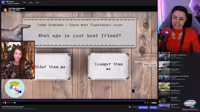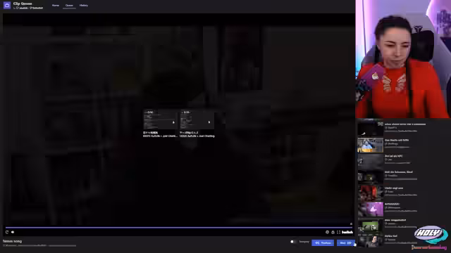01:49:29Die Streamerin beginnt mit der Clip-Queue und kündigt an, auf unangenehme und cringe Clips aus der Vergangenheit von Streamern zu reagieren, die sich wahrscheinlich dafür schämen. Sie plant, diese Reaktionen auch als YouTube-Video zu veröffentlichen. Der erste Clip ist von Katazuri, deren Aussehen sich stark verändert hat, insbesondere Make-up, Haare und Brille. Der zweite Clip zeigt Sonja und Jen, wobei Sonja sich wohlfühlt und Jen eher zögerlich wirkt, als ob sie gezwungen wird. Es wird vermutet, dass Sonja schon früher ein großer Fan der Streamerin war. Ein weiterer Clip zeigt Basel, der sich optisch kaum verändert hat, aber als „Gangster“ mit einem Cut in der Augenbraue beschrieben wird. Es folgen weitere Clips, darunter ein Klassiker von Matteo, der versucht, den Chat vom Tippen abzuhalten, und ein Clip von Kitten, die beeindruckende Klimmzüge macht. Die Streamerin reagiert auch auf einen Clip, in dem jemand Wassermelone nicht mag, was sie als „krassen Ragebait“ empfindet. Es wird ein emotionaler Clip von Leon gezeigt, der ein neues Familienmitglied begrüßt, und ein Clip von Kaddi TV mit einem großen Eiswürfel. Die Streamerin ist fasziniert von der Verwandlung von Streamern durch Make-up, Haare und Bärte und betont, dass das Wichtigste ist, sich selbst zu gefallen.