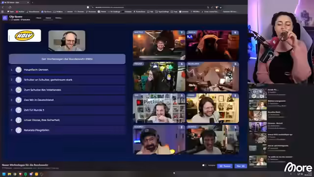 03:09:20Die Streamerin präsentiert die erste Runde von Clips aus dem Chat, die ein Lied namens 'Take the Gun and Shoot the Zombies' enthalten. Sie analysiert den Clip und stellt fest, dass es sich um einen jamaikanischen Stil handelt, der an einen Song erinnert. Sie interagiert weiterhin mit den Zuschauern über verschiedene Themen, von einem weiteren Gaming-Clip bis hin zu einer spontanen Unterbrechung, bei der sie Tim auffordert, seine gefrorene Kamera zu überprüfen.