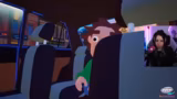 04:00:08Nach mehreren unkontrollierten Fahrmanövern versuchen die Spieler, in einen Park einzufahren und diesen zu dekorieren. Dies gestaltet sich jedoch äußerst schwierig, da sie immer wieder Objekte umfahren oder in sie hineinfahren. Es kommt zu Problemem mit automatischen Türen, Linienführung und der Interaktion mit NPCs, wie einem Polizisten oder einem Mann, der ein Lenkrad verlangt. Die Kommunikation wird durch ständige 'Stopp'- und 'Fahr'-Befehle und Verwirrung über die Steuerung des Autos erschwert.
