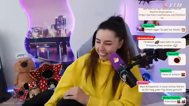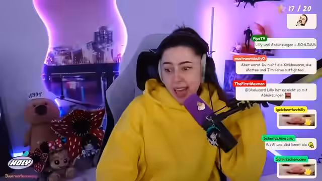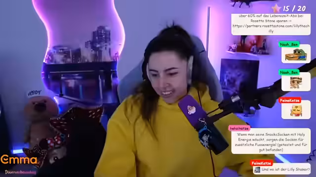 06:22:23Während des Streams treten technische Schwierigkeiten mit einem neuen PC und einem Headset auf, was die Interaktion unterbricht. Für die Zukunft gibt es Pläne für einen IRL-Stream auf der "Kaktus" und ein Treffen mit anderen Streamern, bei dem sie an einem "Streamer-Treff" mit Aktivitäten wie Wettrutschen interessiert ist. Auch wird ein Kartoffel-Engel mit trüffelgewürzten Pommes erwähnt.