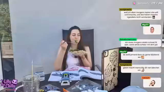 00:13:45Auf Anregung von Sonja entscheidet Lilly spontan für einen Stream auf der Terrasse. Die Terrasse ist zur Hälfte im Umbau und nicht vollständig fertig, was Lilly jedoch nicht stört, da ein kleiner Tisch und ein Gartenstuhl ausreichen. Das Thema des Streams ist Frühstücken und späteres Lego-Bauen. Lilly bereitet im Stream einen Kaiserschmarrn aus einer Fertigpackung zu, was sich aufgrund der fehlenden Routine und komplizierter Anleitung schwierig gestaltet.
