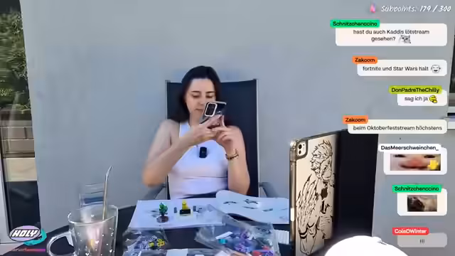 03:16:10Der Fokus des Streams verlagert sich auf das gemeinsame Bauen eines großen Lego-Sets, eines Fortnite-Monsters, das in einem Schiff sitzt. Sie arbeitet an dem Projekt, das sie auf der Gamescom geschenkt bekommen hat, und teilt ihre Fortschritte sowie kleine Fehler mit. Das Bauen dient als entspannende Tätigkeit. Zwischen den Bauphasen unterhält sie sich mit dem Chat über verschiedene Themen, von ihrem geplanten Spenden-Stream über ihre Vorliebe für Zeichnen bis hin zu Anekdoten über ihre Mutter, die während des Kochens alles sofort aufräumt.