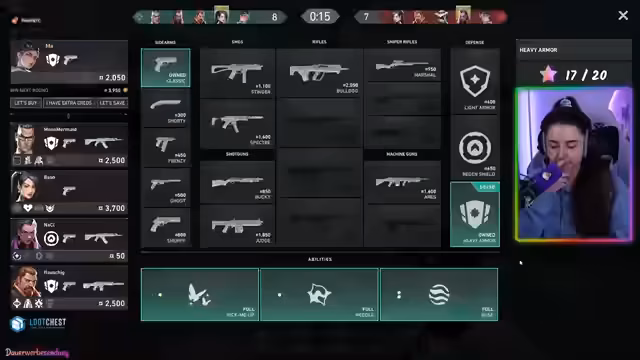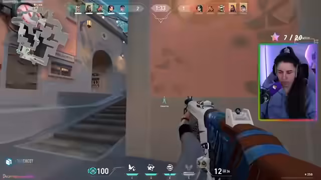 04:48:45Während des Valorant-Spiels kommuniziert die Streamerin aktiv mit ihrem Team. Sie übernimmt die Rolle des Anführers und gibt strategische Anweisungen für den aktuellen Spielmodus 'Breach'. Dabei klärt sie Rollenverteilungen, wie den Einsatz von Smokes und das Halten von bestimmten Zonen. Ihr Team agiert koordiniert, um den Gegner zu überlisten und das Ziel zu sichern. Die Runde verläuft erfolgreich, und das Team nutzt die Kaufrunde strategisch, um sich Waffen und Fähigkeiten zu sichern. Die Kommunikation ist geprägt von taktischen Befehlen und kurzen, klaren Informationen über die Positionen des Gegners.