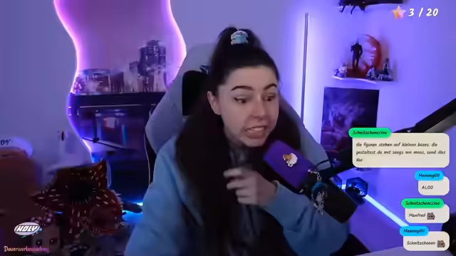 01:17:45Die Streamerin scherzt mit einem Zuschauer über Benzin und dessen Herkunft. Sie spielt Sims und erlebt eine Situation, die sie noch nie zuvor in diesem Spiel gesehen hat. Es wird über das Fahren im Gegenverkehr gesprochen und Witze werden erzählt. Die Streamerin erzählt einen Witz über einen Bastian, der gerne schwimmen geht. Sie bedankt sich für einen Sterni und entschuldigt sich für einen Krampf. Es wird über vegane Hanuta und Maxi King gesprochen. Die Streamerin erinnert sich daran, dass sie mit Jenny ein Spiel spielen wollte, und es wird über vegane Milchschnitte diskutiert. Es wird über eine Folge von How I Met Your Mother gesprochen, in der jemand ein Chili-Lili isst. Die Streamerin warnt vor Spoilern und scherzt über Maden und Insekten in veganen Produkten.