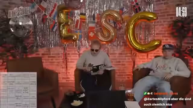 01:25:48Die Streamer entwickeln gemeinsam mit dem Chat ein Bingo für die ESC-Show. Sie sammeln Vorschläge für mögliche Ereignisse, darunter klassische Momente wie einen Flitzer, technische Fehler wie Tontechnik-Probleme oder Stimmbandrisse, seltene Ereignisse wie einen Scheißanfall auf der Bühne oder einen verbotenen Flaggen-Protest, und humoristische Einfälle wie einen unangenehm nahen Interviewstil oder einen Falschmeldung der Moderatoren.