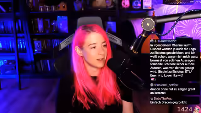00:41:54Ein Höhepunkt des Streams ist der Gast Drakon. Er wird als wichtige Quelle politischer Bildung beschrieben, die der Streamerin hilft, mit aktuellen Weltgeschehen umzugehen. Eine humorvolle Interaktion entwickelt sich, in der die Streamerin Drakon für fiktive Charaktertode in ihren Büchern verantwortlich macht. Die Unterhaltung ist geprägt von Sarkasmus und einem besonderen Insider-Witz zwischen den beiden.