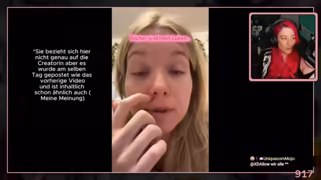 00:40:35Die Streamerin beginnt mit der Reaktion auf das ihr zugespielte Video von Nessa DHS zum Thema Booktalk. Sie stellt klar, dass sie die Content Creatorin nicht persönlich kennt und sich neutral positioniert. Sie definiert ihre Haltung ab: Sie reagiert auf Systemkritik, möchte jedoch jegliches persönliche Drama und "Beef" vermeiden, da dies nicht ihr Vibe ist und sie keine Öl-in-das-Feuer-Gießerin sein möchte. Der Fokus liegt auf der strukturellen Kritik.