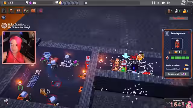 02:26:44Es wird ein weiterer Trankspender gebaut, da offensichtlich Bedarf besteht, und eine Wandfackel darüber platziert, um die Sicht zu verbessern. Es wird festgestellt, dass nicht genug Geld für einen weiteren Raum vorhanden ist, obwohl die Finanzen gut aussehen. Es wird überlegt, mehr Monster zu spawnen, aber dafür fehlt das Geld. Die vorhandenen Spawner könnten mit Seelen aufgewertet werden. Es wird überlegt, die Spawner nach vorne zu verlegen, um es den Abenteurern schwerer zu machen und sie zu töten. Das Ziel ist es, sieben Leute zu töten. Es wird festgestellt, dass es gut läuft und bereits zwei bis drei Leute getötet wurden. Die Abenteurer, die den Dungeon verlassen, sind glücklich. Es wird sich gefragt, wie Geld in die Truhen gelangt. Es wird festgestellt, dass das Gold von toten Helden und Monstern stammt. Es wird festgestellt, dass die Truhen leer sind, weil niemand stirbt. Es wird sich über die mangelnde Zufriedenheit mit dem Loot beschwert. Es wird ein Angriffstotem gekauft. Ein Energietrankspender wird gebaut und die Spawner nach hinten verschoben. Es wird festgestellt, dass das Spiel pleite ist. Es wird erklärt, dass Abenteurer das Gold aus den Truhen nehmen können. Die Truhen sind voll. Das Angriffstotem gewährt Helden in der Nähe einen geringfügigen Angriffsbonus. Es wird eine Holztruhe gebaut. Es wird mehr Besucherverkehr erforscht. Es wird festgestellt, dass der Schädel zu teuer ist. Es wird der nächste Tag gestartet. Es wird sich ein Raum mit einem Labyrinth gewünscht. Die Kamera wird etwas nach unten verschoben, um eine bessere Sicht zu gewährleisten.