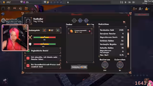 04:06:15Es wird festgestellt, dass der Dungeon einen Stern erreicht hat. Der Streamer fragt den Chat nach seiner Bewertung des Spiels auf einer Skala von 1 bis 10 und gibt selbst eine 9. Die anfänglichen Zweifel aufgrund des langsamen Pacings werden beiseite gewischt, da es jetzt relativ schnell geht. Es wird ein Podcast namens 'die Horde' erwähnt, der von Krong, Pandoria, Funk und anderen gemacht wird. Das Ziel des Spiels wird zusammengefasst: Helden kommen in den Dungeon, lassen Cash da und sollen happy sein. Es wird ein Energiespende-Ding gemacht, um den Zauber aktivieren zu können. Es wird festgestellt, dass die Fledermaus im Dungeon sehr stark ist. Es wird überlegt, ein Monster aus dem Dungeon zu entfernen, da die Helden zu heftig auf den Sack bekommen. Es wird festgestellt, dass das Respawn-Podest sehr beliebt ist und die Tränke erweitert werden. Es wird überlegt, größere Monster zu beschwören, aber beschlossen, lieber noch ein bisschen zu sparen. Es wird festgestellt, dass es den Helden besser gefällt, jetzt wo ein Monster weniger im Dungeon ist. Das Ziel ist es, einen 5-Sterne-Dungeon zu haben. Es wird ein Versammlungstisch freigeschaltet. Das Spiel bekommt eine Bewertung zwischen 7 und 9 und hat Spaß gemacht. Es wird angekündigt, dass es morgen um 17 Uhr auf dem Kanal von Raz weitergeht und am Dienstag um 13:30 Uhr sowie am Dienstag um 19 Uhr mit Avatar Pen & Paper.