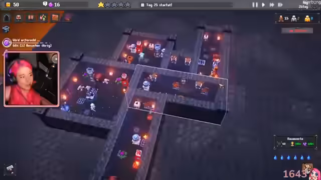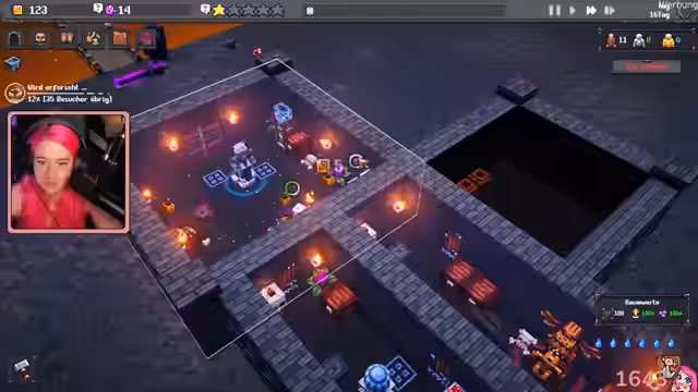 02:08:11Nach der Beendigung der Anno-1404-Demo wechselt die Streamerin zum Spiel Dungeon Tycoon, nachdem sie es bei einem anderen Streamer gesehen hatte. Sie beginnt, einen eigenen Dungeon zu entwernen, indem sie zunächst Türen, Truhen und Monster-Spawner platziert. Ziel ist es, Abenteurer anzulocken, sie zu töten oder zu ärgern und so Geld und Seelen zu verdienen, um den Dungeon weiterzuentwickeln.