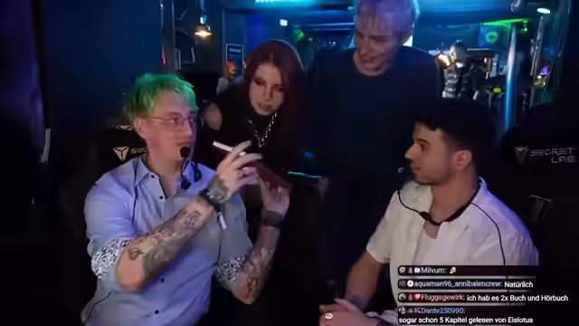 01:59:21Der stream wird durch den eintritt von gästen, insbesondere dem sänger von feuerschwanz, 'ben', belebt. dieser stellt sich vor und wird über seine ersten eindrücke vom buch befragt. es entwickelt sich ein teleshopping-artiger segment, in dem die artikel vorgestellt und verkauft werden. es wird ein spezieller rabattcode für den vertrieb der ware angekündigt. der fokus liegt auf der vermarktung der kerze und des pullis, wobei deren eigenschaften und der duft immer wieder hervorgehoben werden.
