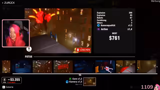 01:45:42Die Spielerinnen befinden sich in einer turbulenten Szene in Paris, wo sie versuchen, den brennenden Eiffelturm und andere Katastrophen zu fotografieren. Die Streamerin schlägt vor, ein Foto von Findelfuchs' Tod zu machen, da dies viel Geld einbringen würde. Sie finden eine Kamera mit einem 50%-Bonus und diskutieren über die besten Strategien, um Punkte zu sammeln. Trotz der Gefahren und des Chaos schaffen sie es, den Helikopter zu erreichen und das Level abzuschließen. Die Streamerin kommentiert humorvoll, dass es eine 'Findelfuchs-Reportage' war, da Findelfuchs im Spiel oft in gefährliche Situationen geriet. Sie reflektieren über die gesammelten Punkte und überlegen, welche Upgrades sie kaufen sollen, um für die nächste Runde besser gerüstet zu sein.